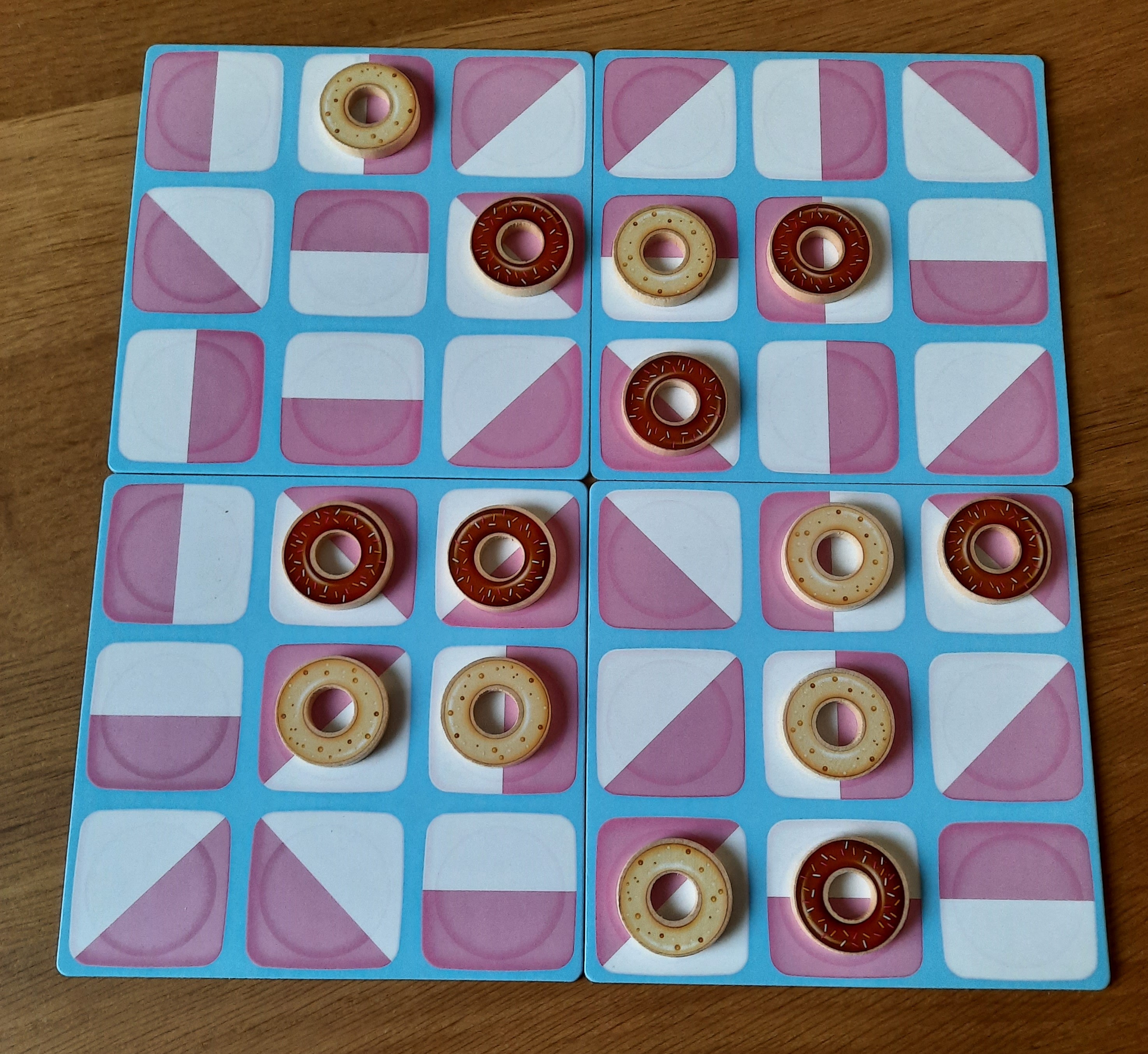 Avant de se lancer dans une partie, il faut dabord constituer une grille de six cases sur six au moyen de quatre plateaux de 3 sur 3, recto verso et orientables dans tous les sens. Ce qui donne 24.576 configurations possibles et donc limpossibilité de retenir les meilleures ouvertures. En outre, aucun avantage à être le premier joueur (désigné en lançant un pion donut en lair et en regardant la couleur visible après quil est retombé): les plus de 227.292 parties jouées sur BGA montrent quentre les deux joueurs, cest du 50/50.