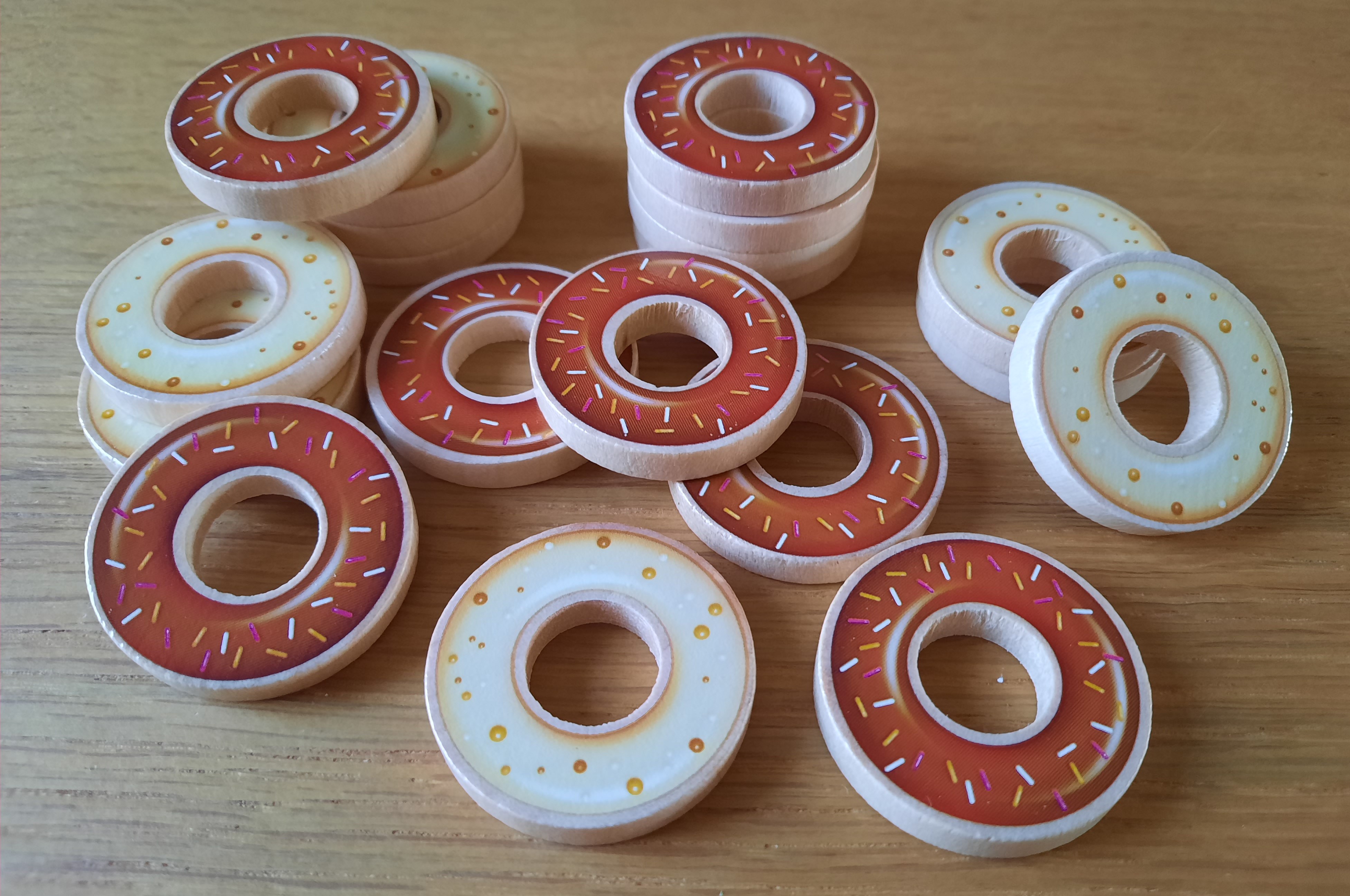 Chaque joueur reçoit ensuite 15 pions donut quil oriente du côté de sa couleur: chocolat blanc ou au lait. Car, oui, les pions sont eux aussi recto verso.