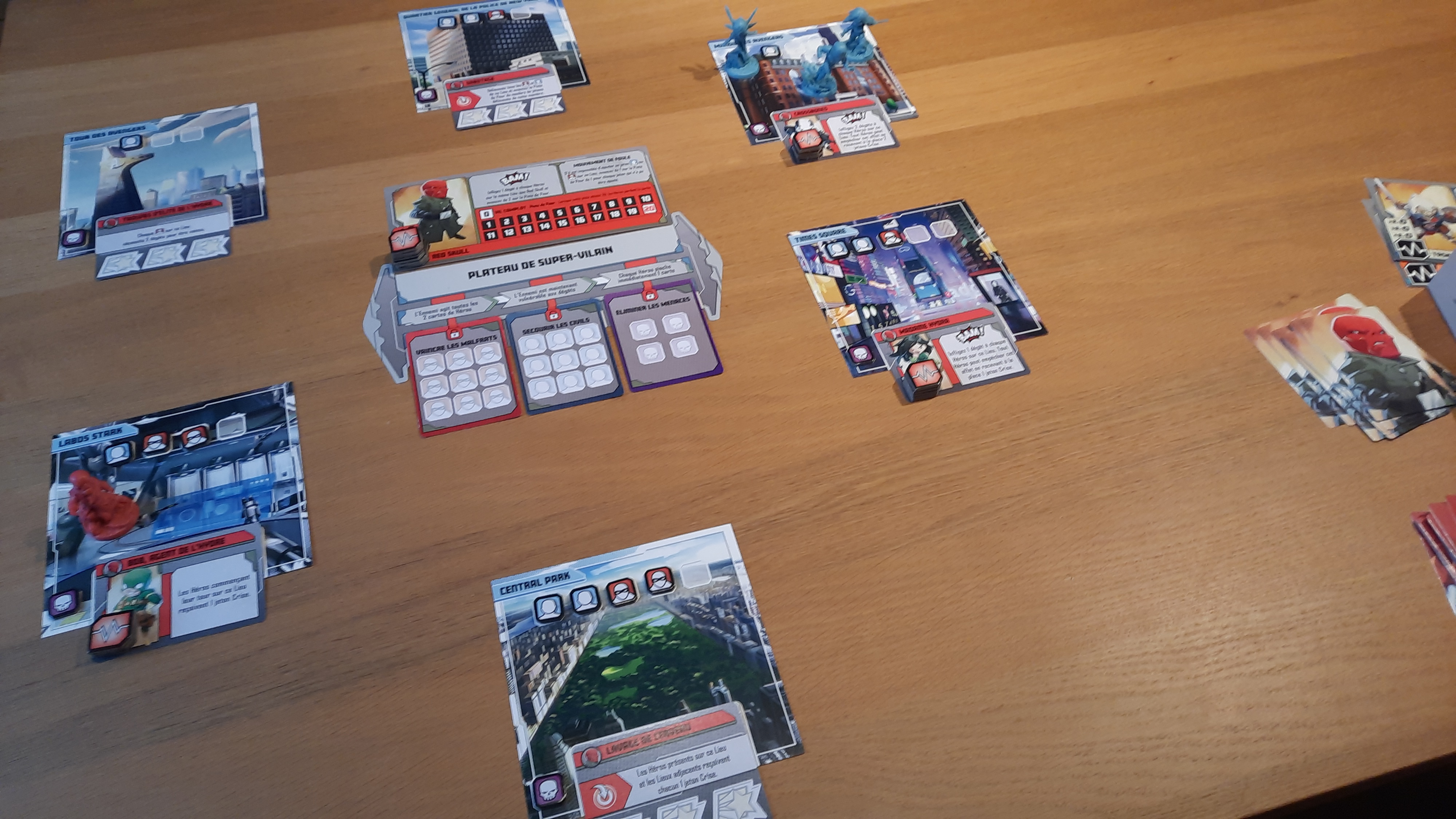 Sajoutent encore quelques petites choses: le lieu offre un effet bonus lorsquil ne possède plus de carte Menace, certaines actions sont des jokers, trois cartes Défis permettent de rajouter autant de niveaux de difficulté supplémentaires et des jetons Crise sont utilisés par certains super-vilains pour gêner les héros.