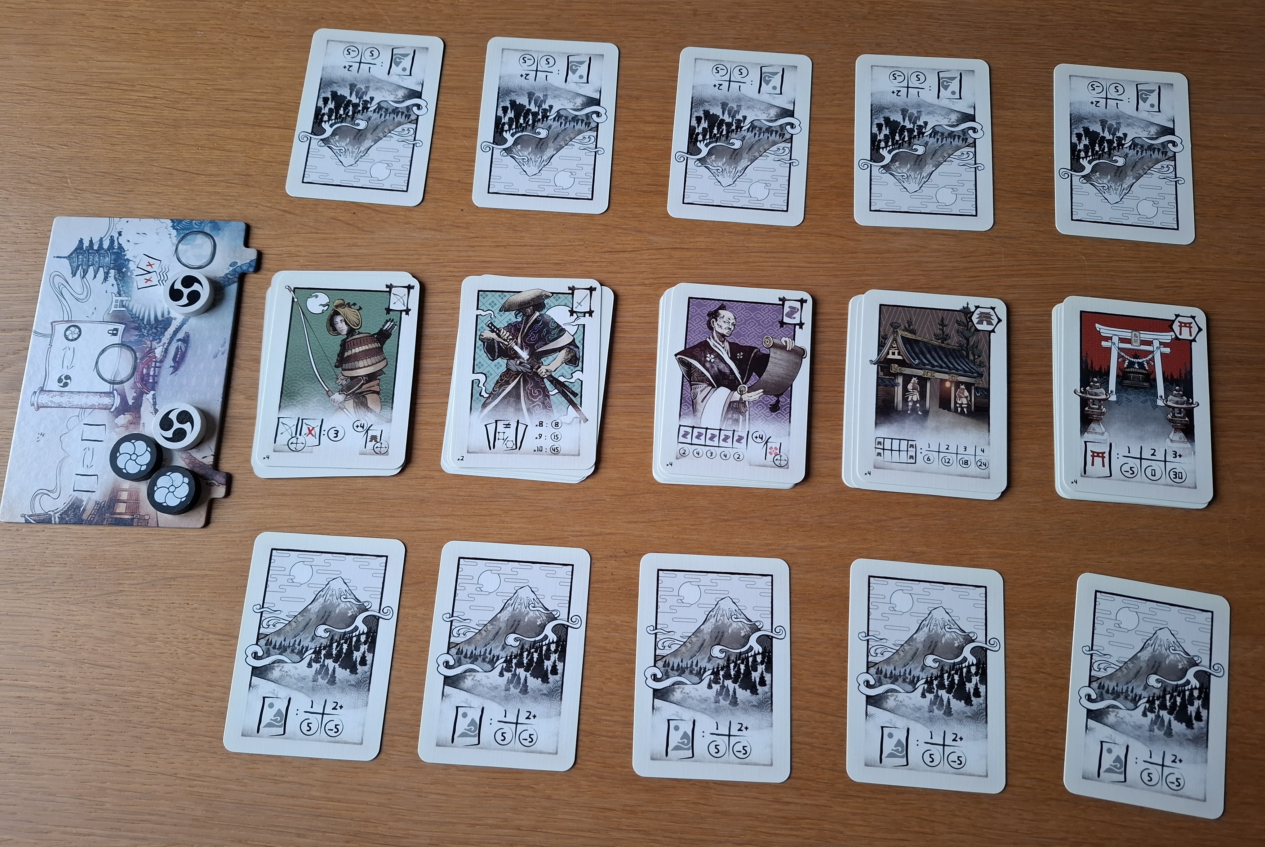 «Naishi» se joue tout dabord avec un paquet de cartes «Développement» que lon va, en début de partie, répartir en une rivière de cinq pioches de six cartes, la carte du dessus étant visible. Cette rivière est placée entre les deux joueurs. De chaque côté de cette rivière se trouve la ligne de chaque joueur, composée de cinq cartes «Montagne». Enfin, chacun reçoit une main de cinq cartes, trois «Montagne» et deux «Développement». Ces cartes sont mélangées; puis, leur ordre est figé.