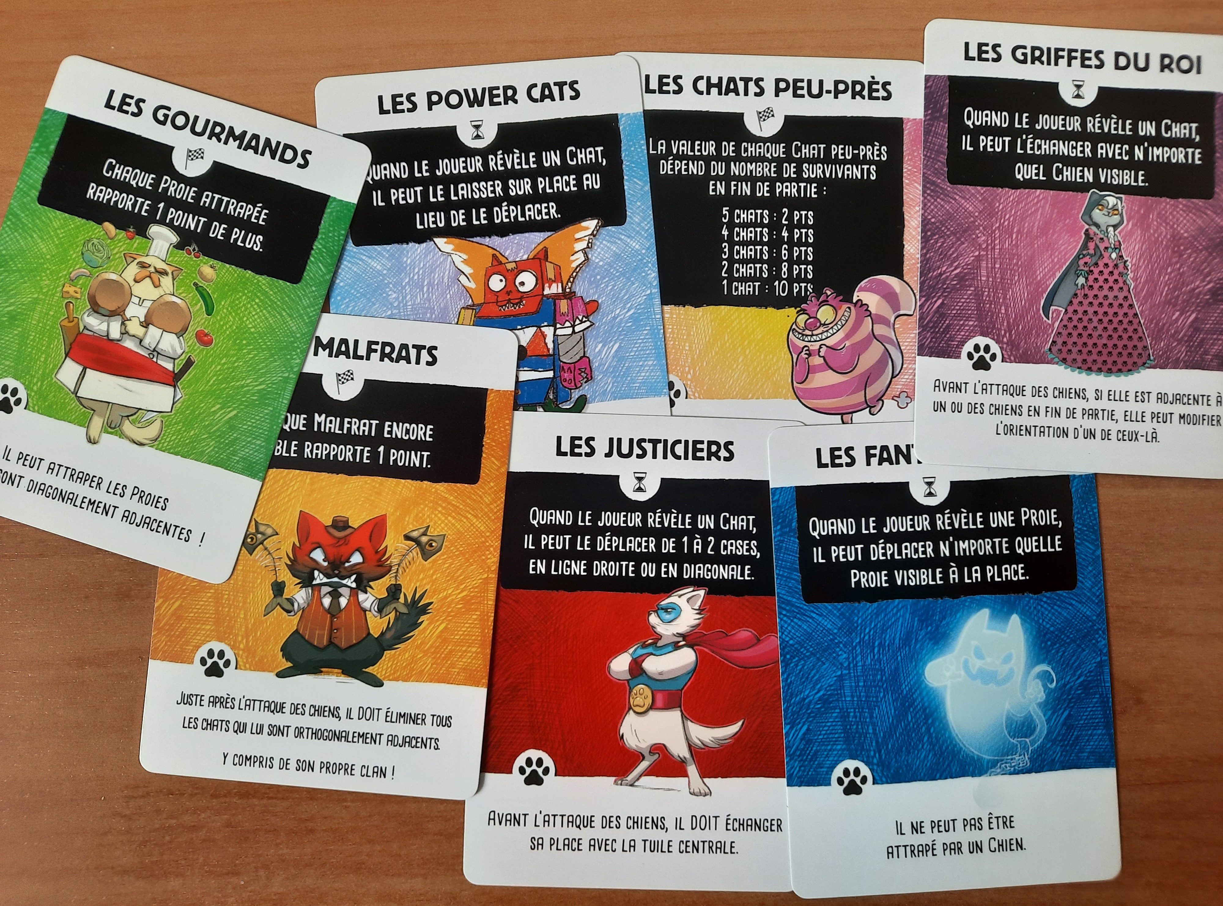 Rien que comme ça, «Chats de poche» constitue un petit jeu redoutable, avec une belle profondeur. Mais celle-ci saccroit encore avec lutilisation des différents clans. Il y en a effet six dans la boîte (sept si vous disposez du premier tirage du jeu), avec des pouvoirs différents qui sactivent quand une tuile est retournée, pour le chef du clan (lun des chats) et/ou pour le comptage des points.
