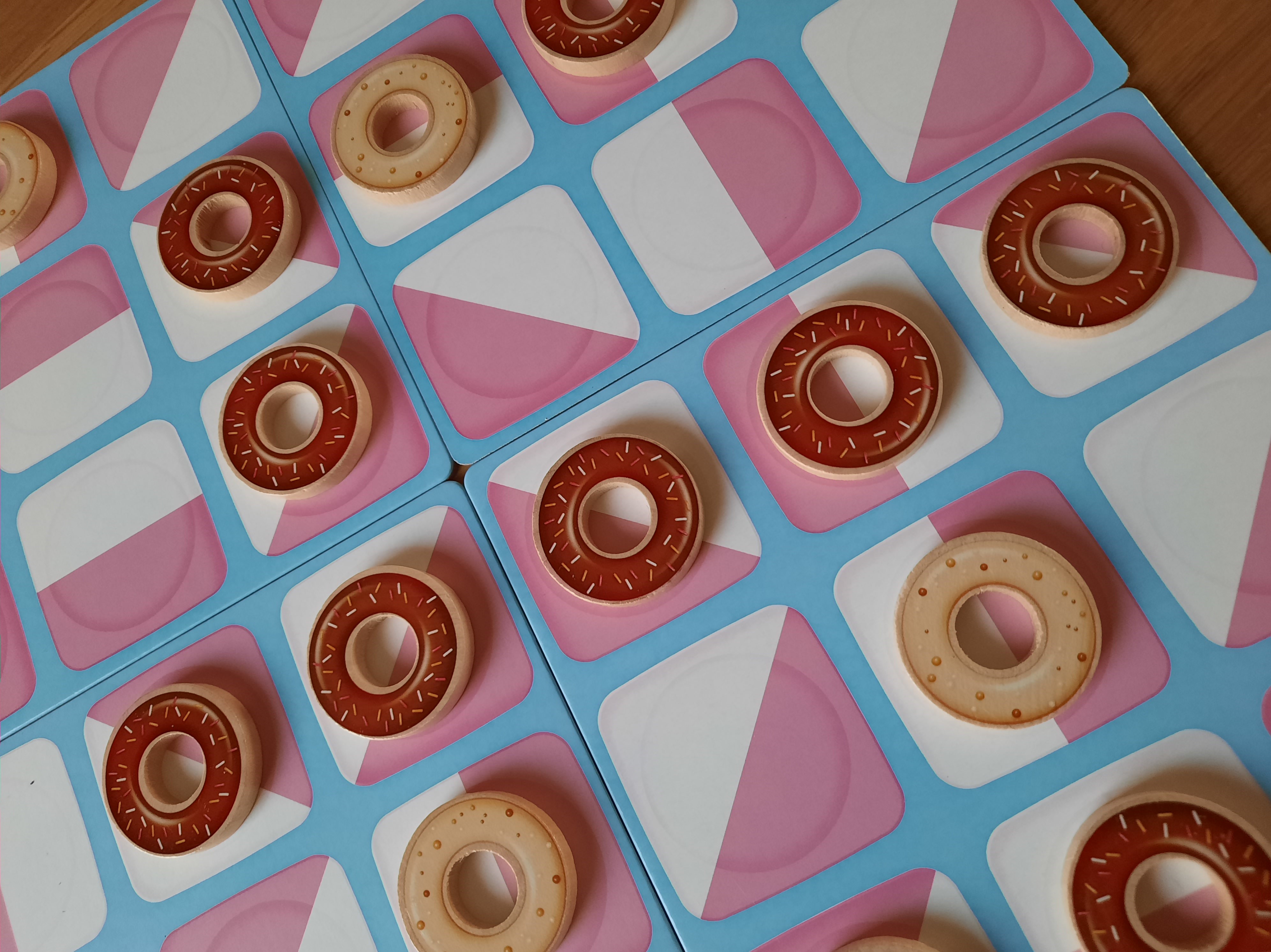 Avant de se lancer dans une partie, il faut dabord constituer une grille de six cases sur six au moyen de quatre plateaux de 3 sur 3, recto verso et orientables dans tous les sens. Ce qui donne 24.576 configurations possibles et donc limpossibilité de retenir les meilleures ouvertures. En outre, aucun avantage à être le premier joueur (désigné en lançant un pion donut en lair et en regardant la couleur visible après quil est retombé): les plus de 227.292 parties jouées sur BGA montrent quentre les deux joueurs, cest du 50/50.