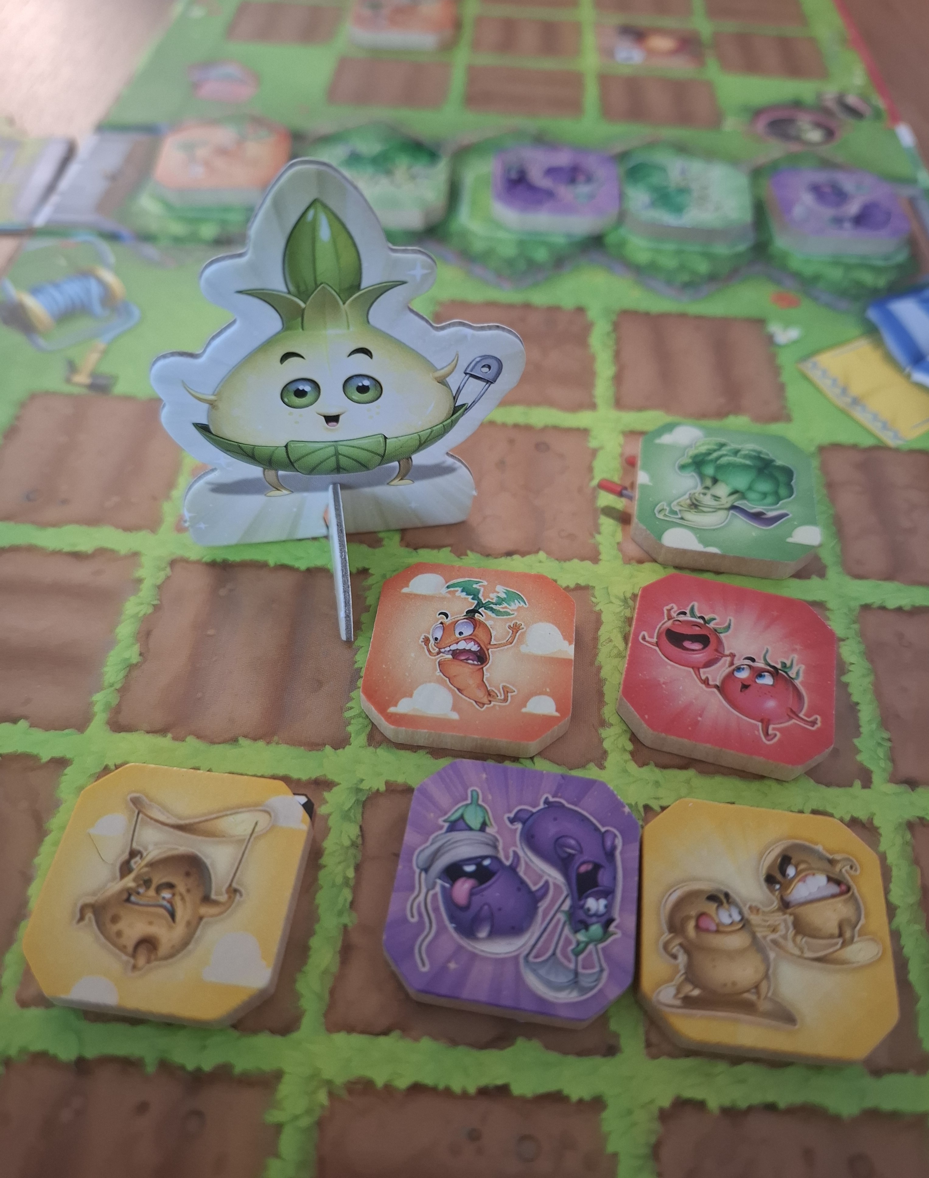 Lorsquun joueur décide de récolter, il doit respecter un schéma différent en fonction des légumes. Par exemple, pour récolter des carottes, il en faut deux ou quatre en diagonale, qui rapportent respectivement deux ou quatre points. Si deux légumes sont visibles sur un jeton récolté, le jeton est retourné sur sa face un légume. Sinon, il est retiré du jeu.