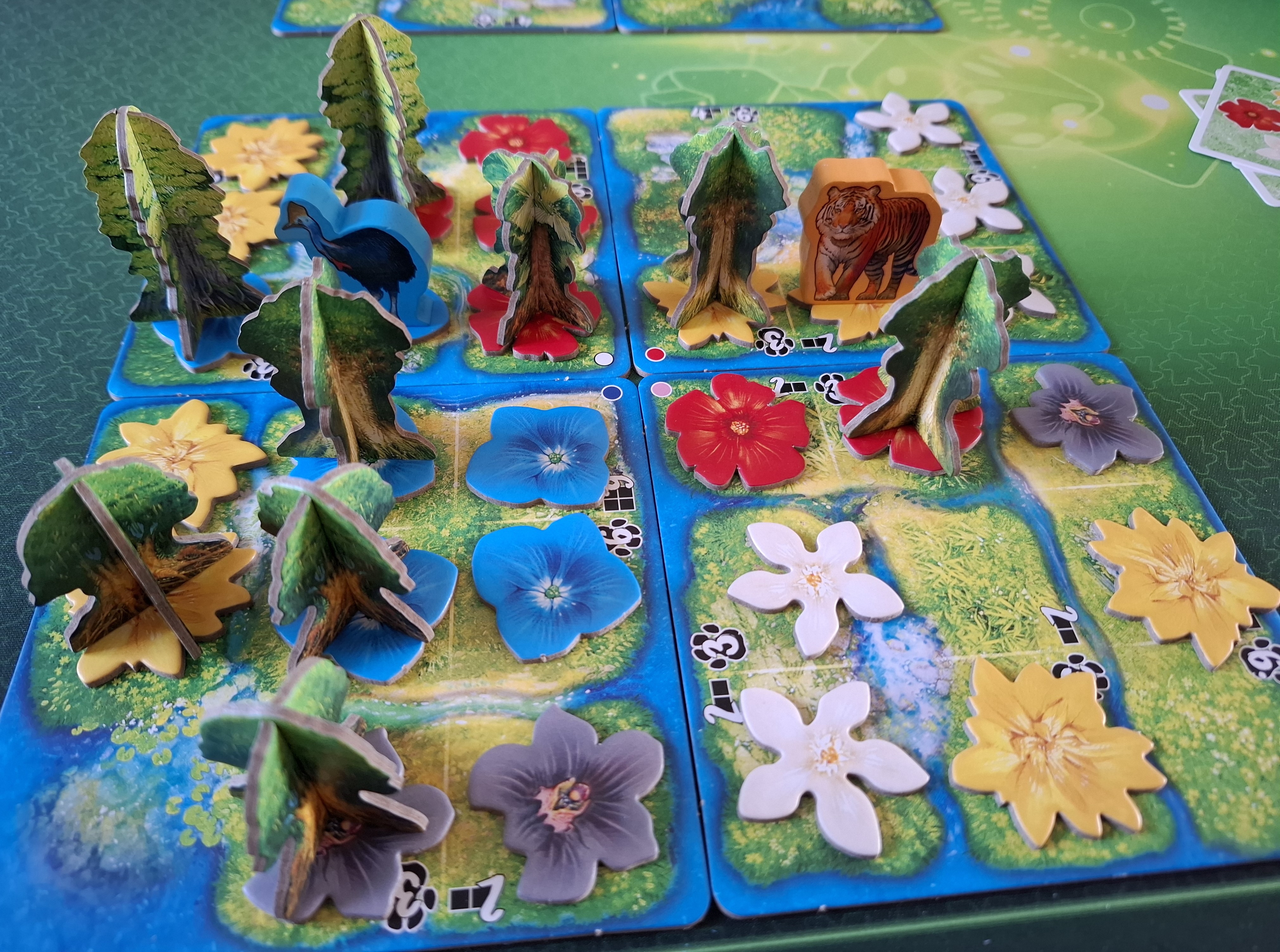 Les fleurs doivent être posées sur des cases vides adjacentes à des cases déjà fleuries, ou sur des cases déjà fleuries. Une seconde fleur sur une case est remplacée par un arbre. Et lorsquune zone est complètement recouverte darbres, le dernier arbre est remplacé par un animal de la couleur correspondante. Celui-ci a pour effet de fertiliser les cases adjacentes, cest-à-dire dajouter une fleur si la case est vide ou dajouter un arbre sil y a déjà une fleur. Mais attention: le nombre de chaque animal est limité à deux (deux joueurs) ou trois (trois ou quatre joueurs).