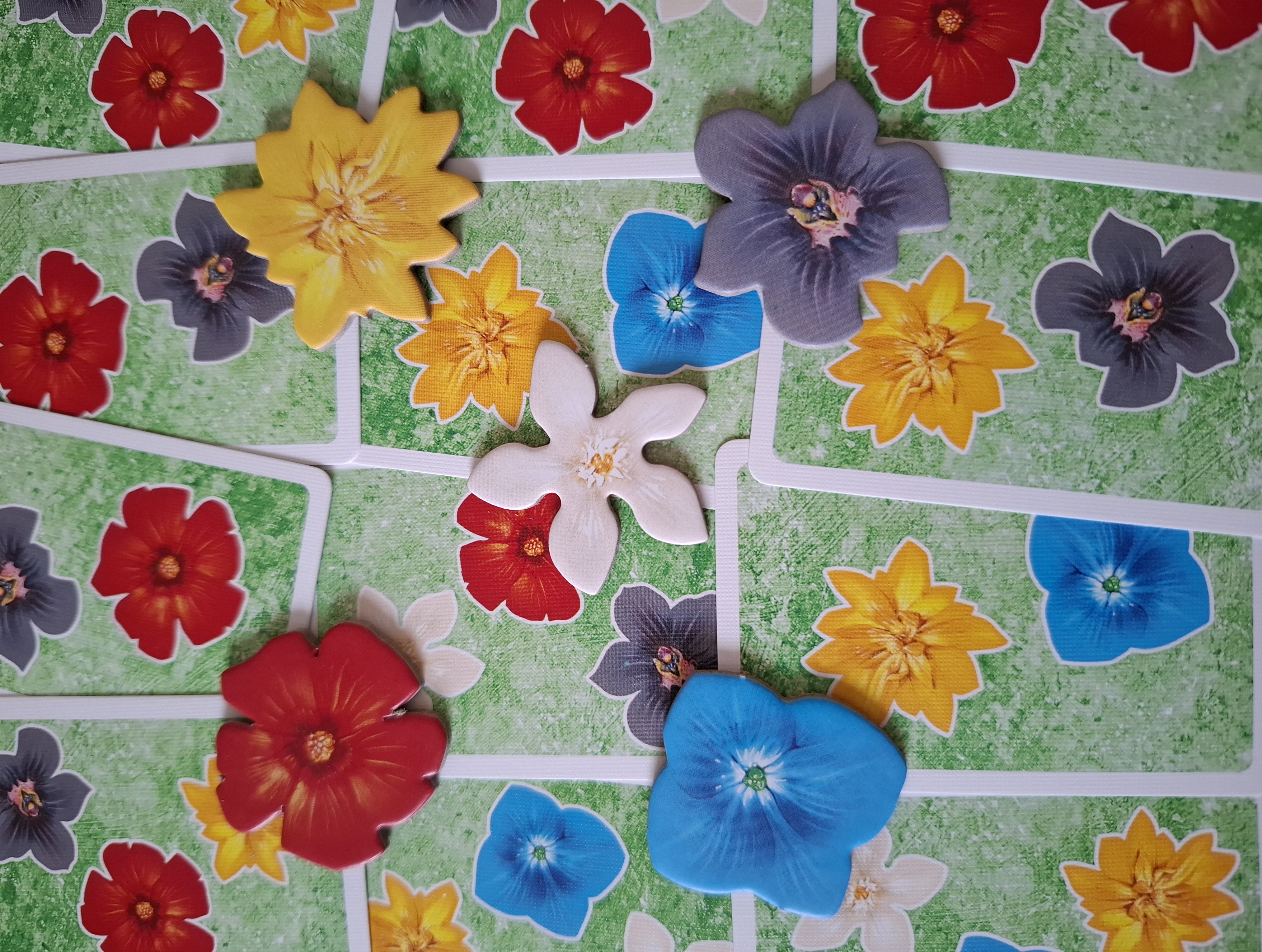 Le premier objectif est le constituer des zones (il y en a de 3, 4 ou 5 cases) avec des fleurs de la même couleur. Chaque zone homogène rapportera des points en fin de partie; une zone hétérogène ou incomplète en fera perdre.