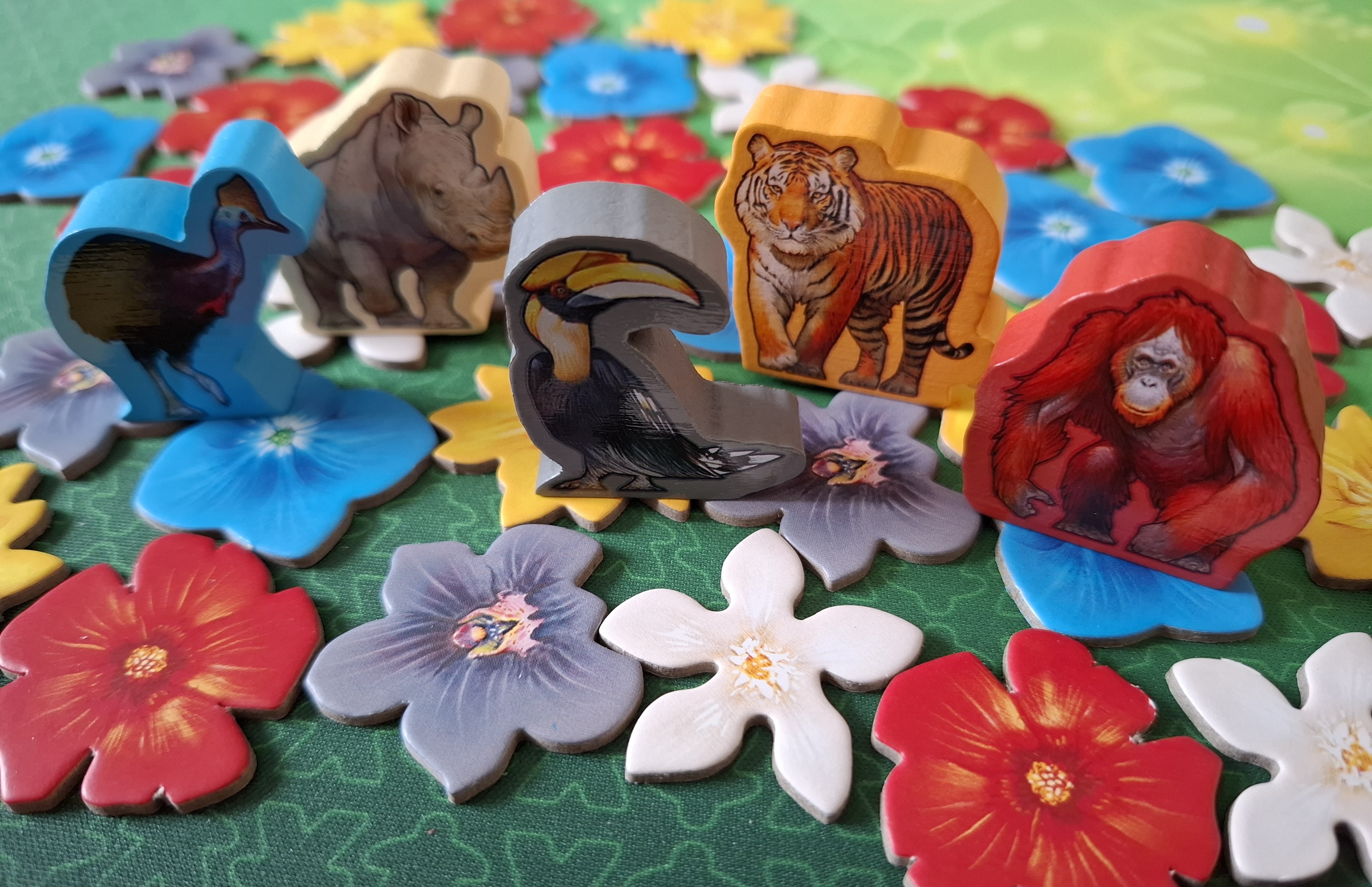 Daniel Skjold Pedersen et Asger Harding Granerud ont déjà régalé les joueurs, notamment avec «Copenhagen», «Deep Blue» et surtout «Heat». Leur dernier jeu en date nous offre un nouveau changement dambiance puisque nous nous enfonçons dans la forêt («hutan» en indonésien) tropicale pour y faire pousser des fleurs et des arbres et attirer les animaux.