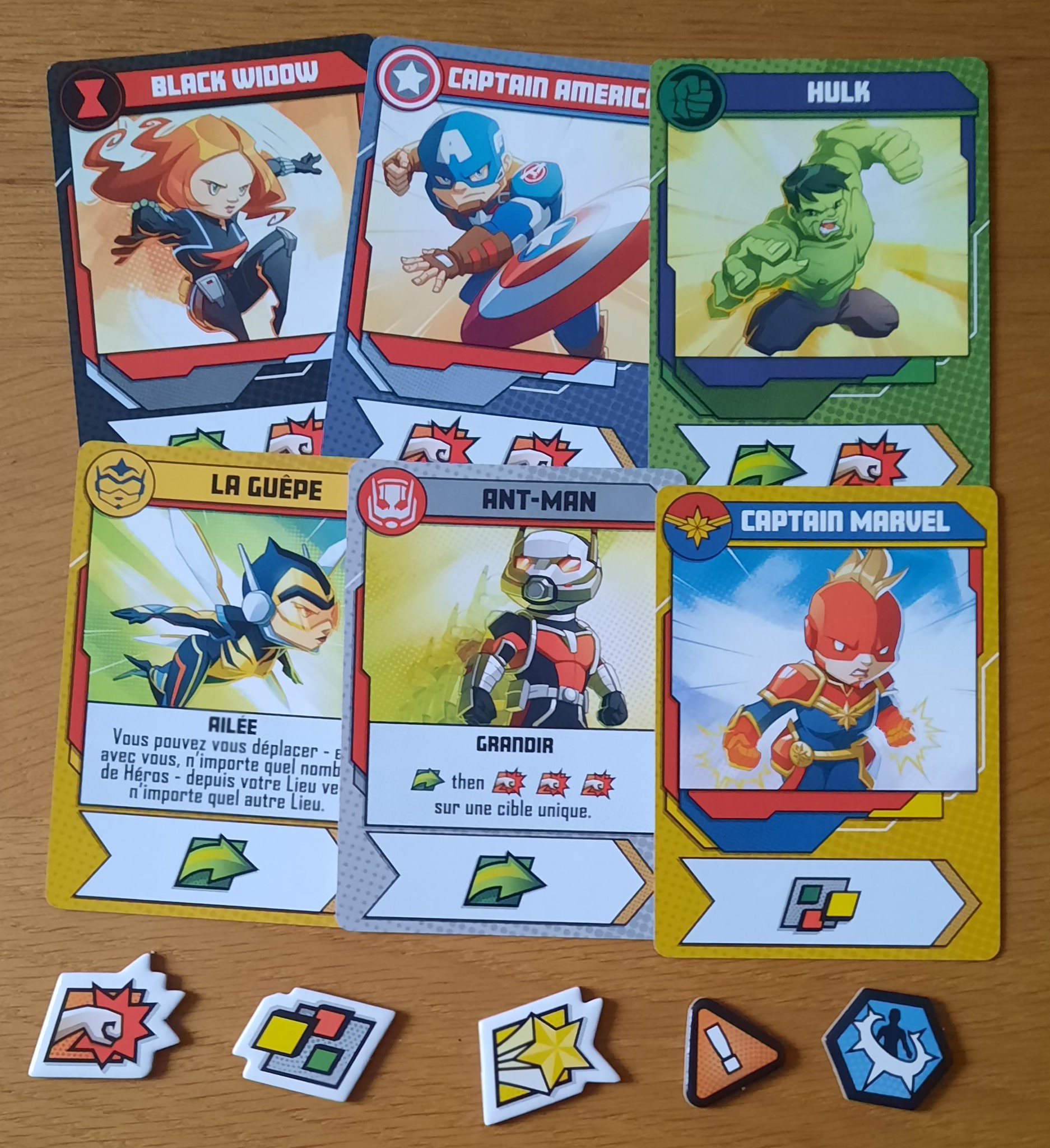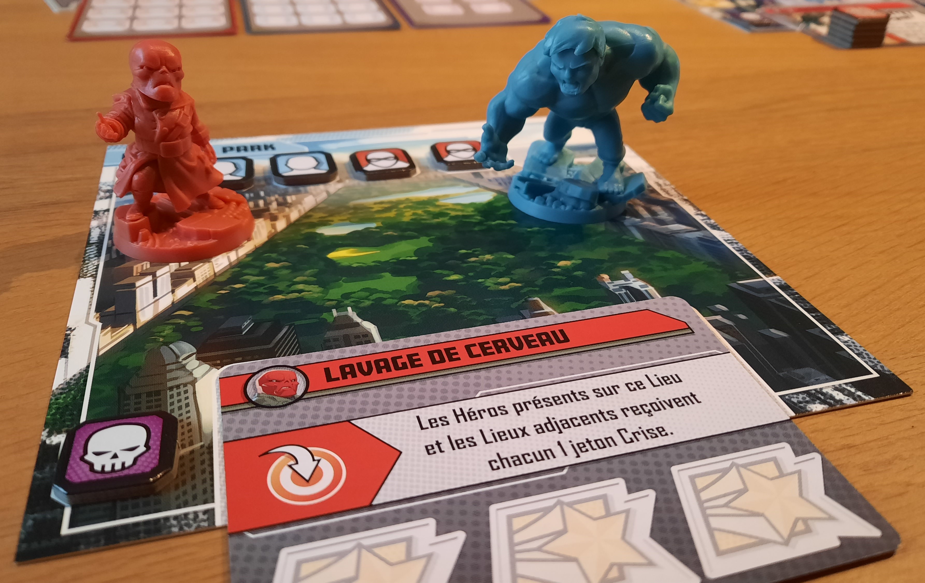Sajoutent encore quelques petites choses: le lieu offre un effet bonus lorsquil ne possède plus de carte Menace, certaines actions sont des jokers, trois cartes Défis permettent de rajouter autant de niveaux de difficulté supplémentaires et des jetons Crise sont utilisés par certains super-vilains pour gêner les héros.