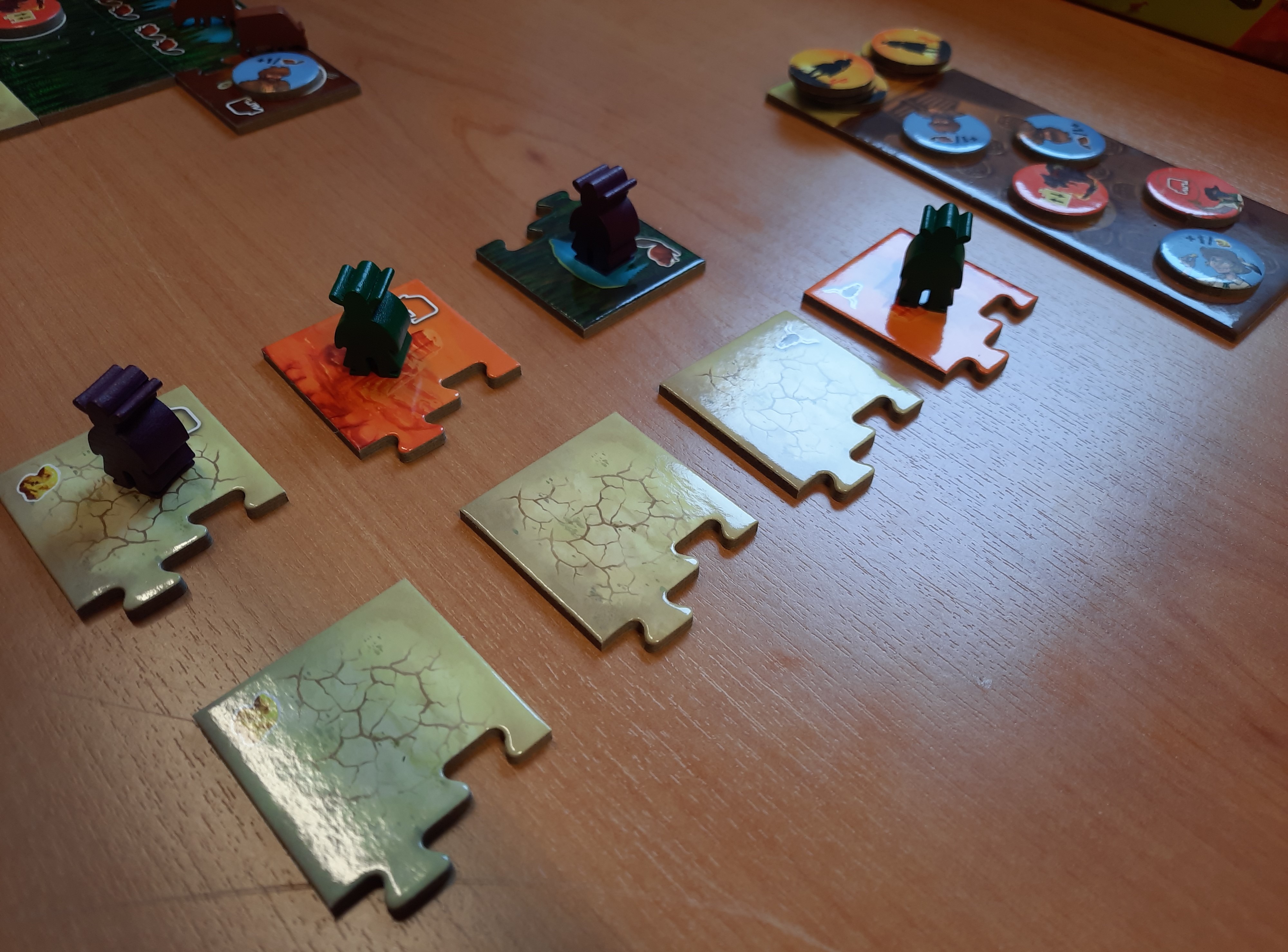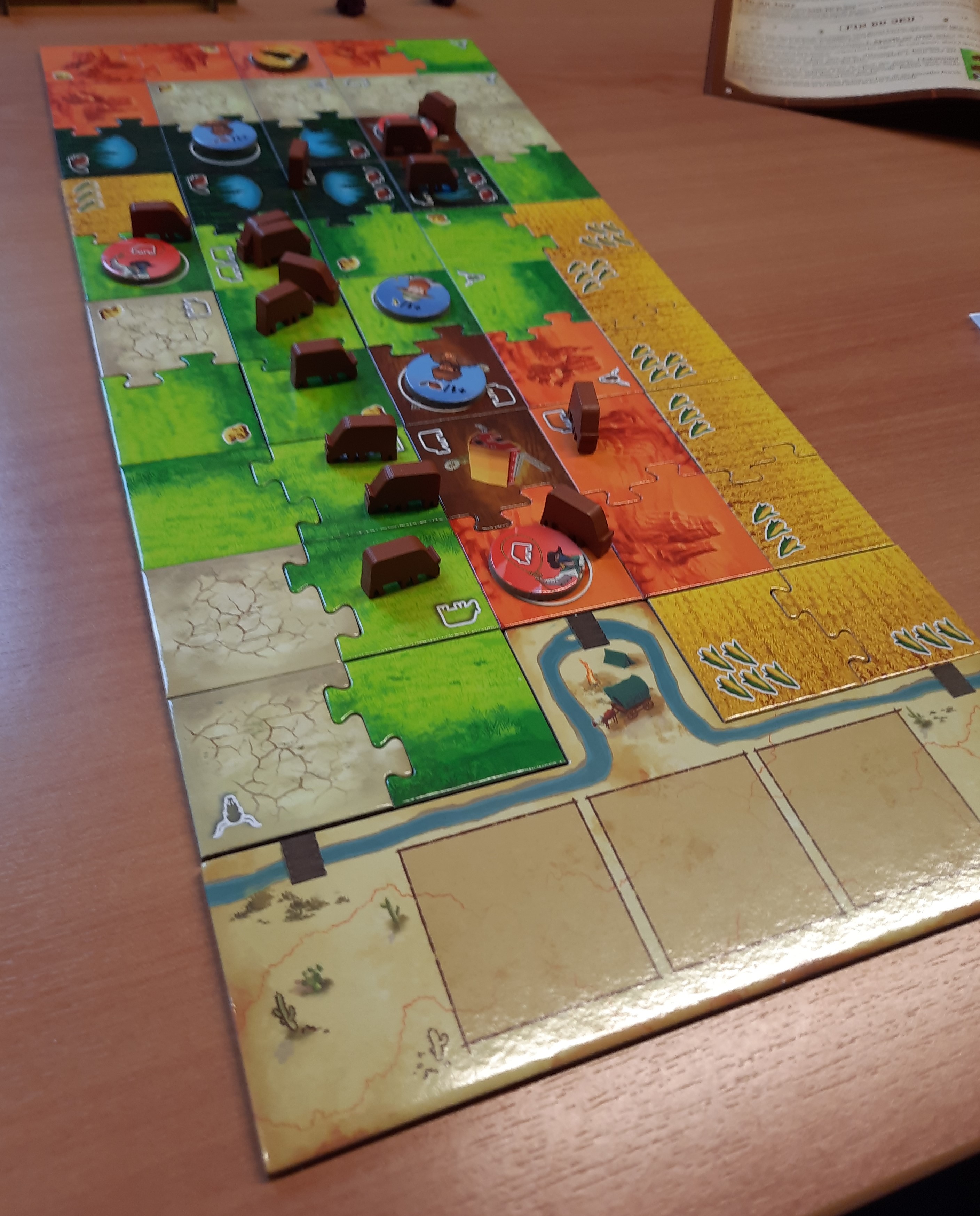 Outre les points rapportés par les territoires, il y a aussi ceux que vous offrent les pépites dor, les castors et les épis de maïs, à raison dun point par unité en fin de partie. En outre, si vous disposez dans votre ranch de chercheuses dor, de trappeurs ou de cultivateurs, ils vous rapporteront chacun un point de plus par ressource concernée. Et tout ce petit monde, comme le desperado et la voleuse de vache, vous pouvez le recruter au saloon, lorsque vous déposez un domino muni dun cercle. Toutefois, au moment de recruter lun de ces associés, vous devrez choisir entre son pouvoir et lopportunité de déplacer une vache de trois parcelles (ou trois vaches dune parcelle). À chaque fois, un choix cornélien, comme les nombreux dilemmes que vous devrez trancher durant toute la partie, histoire de bien aménager votre ranche et doptimiser votre score.