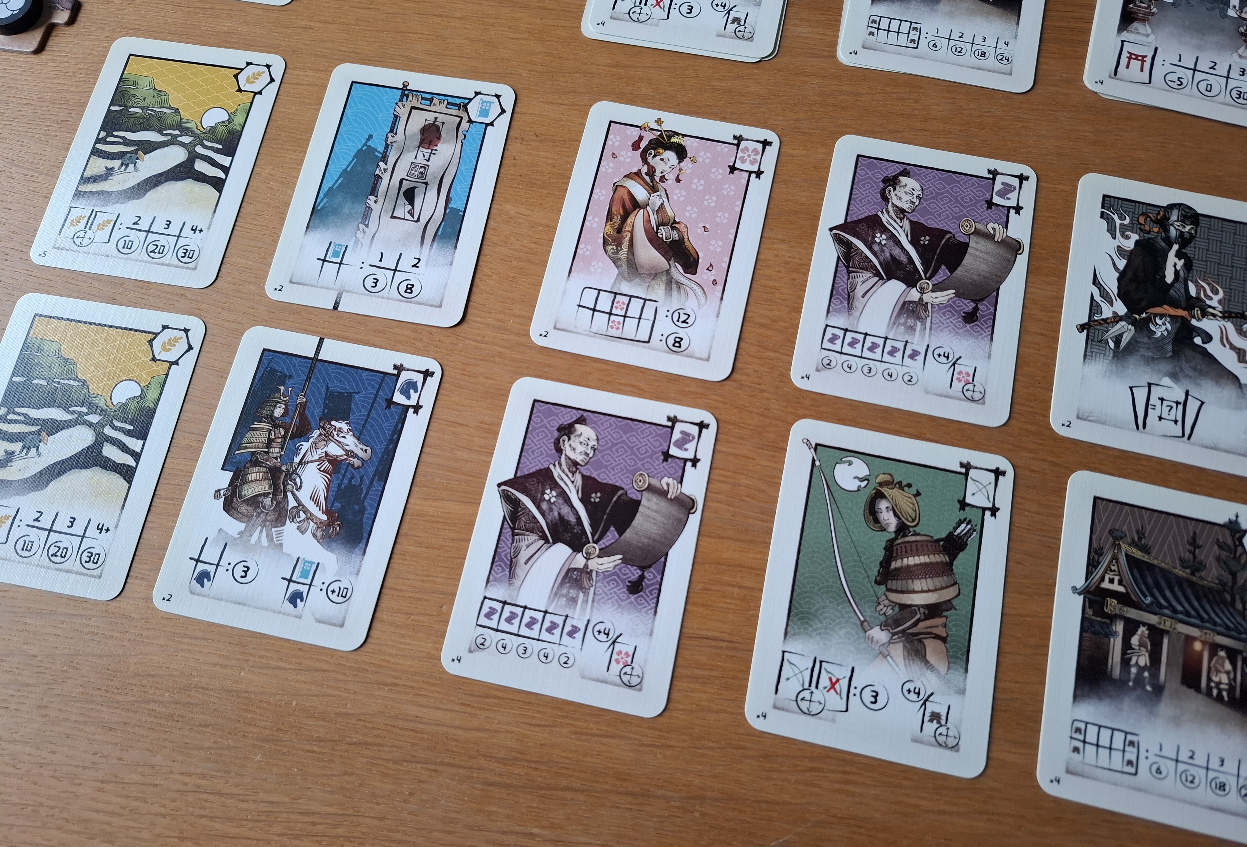 Si ça sarrêtait là, le jeu serait somme toute banal. Mais il se joue aussi avec des émissaires que lon peut envoyer à la cour impériale (représentée par un petit plateau). Chaque adversaire reçoit en début de partie deux jetons «Émissaire». À son tour, un joueur peut effectuer une action additionnelle: défausser deux cartes visibles de la rivière et révéler les cartes en-dessous, ou inverser la position de deux cartes (soit de la rivière, soit de sa ligne, soit de sa main, soit une carte de sa main avec la carte occupant la même position dans sa ligne). À la cour, deux emplacements sont disponibles pour la première action et trois pour la seconde. Les émissaires risquent donc de sy bousculer. Bien entendu, un joueur peut rappeler ses émissaires, mais cela lui coûte son tour. Enfin, il est également possible dimposer un décret impérial. Cette action coûte elle aussi un tour et est extrêmement puissante puisquelle permet déchanger une carte de votre main avec la carte occupant la même position dans la main de votre adversaire, ou une carte de votre ligne avec la carte occupant la même position dans la ligne de votre adversaire. Pour réaliser cette action, vous devrez placer un de vos jetons «Émissaire» sur lunique emplacement ad hoc de la cour. Votre émissaire devra y rester jusquà la fin de la partie. Impossible donc de le rappeler! Cela signifie aussi que votre adversaire ne pourra pas y recourir.