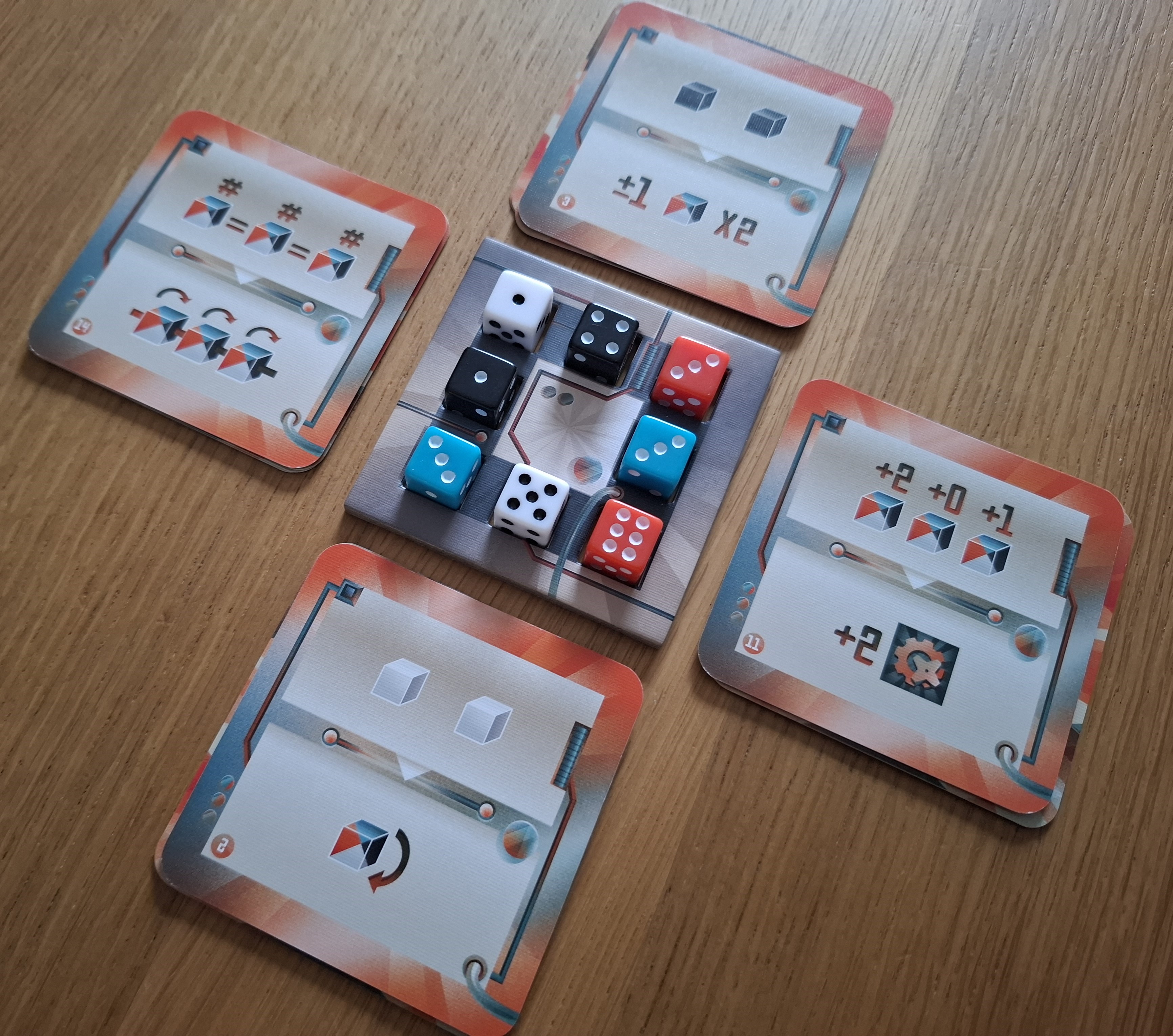 Pour bien agencer les dés afin de résoudre des cartes, il convient donc dutiliser judicieusement leffet des récompenses ou de bricoler. Pour ce faire, vous pouvez utiliser vos jetons bricolage: un pour intervertir deux dés adjacents et deux pour changer la valeur dun dé.