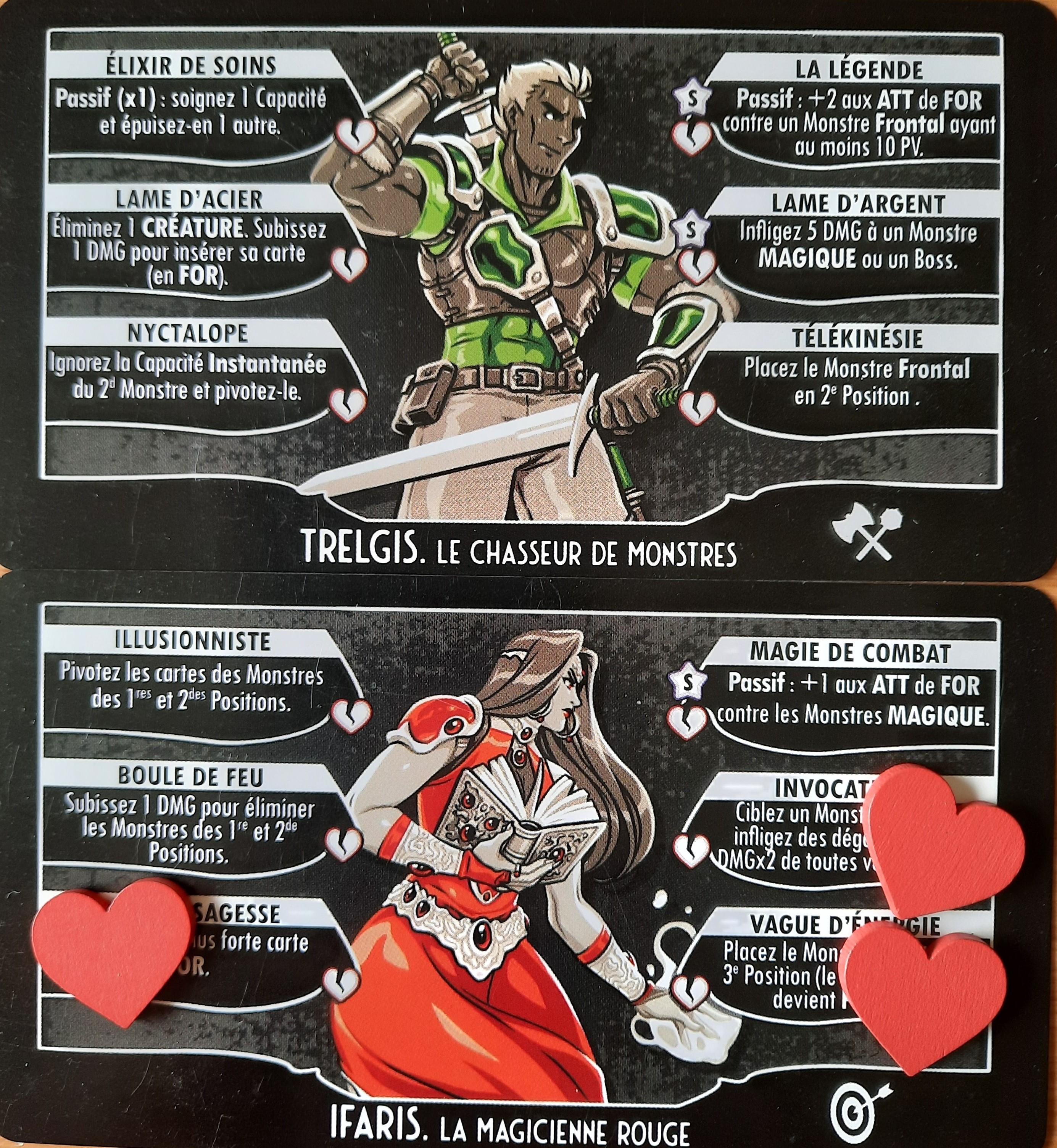 Votre serviteur ne peut donc que vous conseiller dutiliser un support pour y déposer vos cartes et profiter ainsi pleinement de votre partie. Léditeur français du jeu, Bad Boom Games, a dailleurs ajouté des «trackers», sortes de petites pinces destinées à être glissées sur les cartes. Elles ne tiennent toutefois que moyennement. On préférera dès lors sans doute les placer sur les cartes posées bien à plat et/ou utiliser les cinq petits curs en bois pour marquer les capacités utilisées.