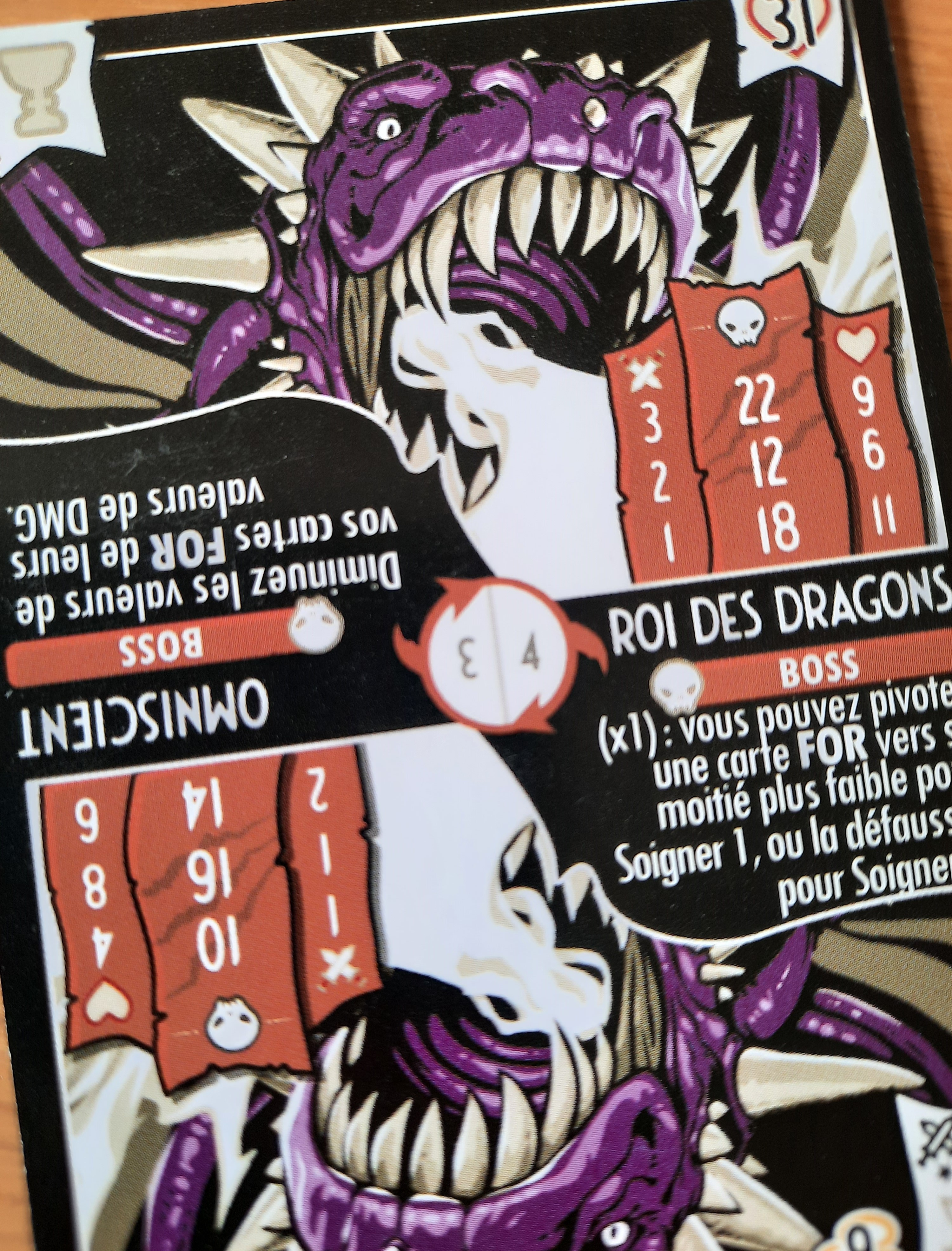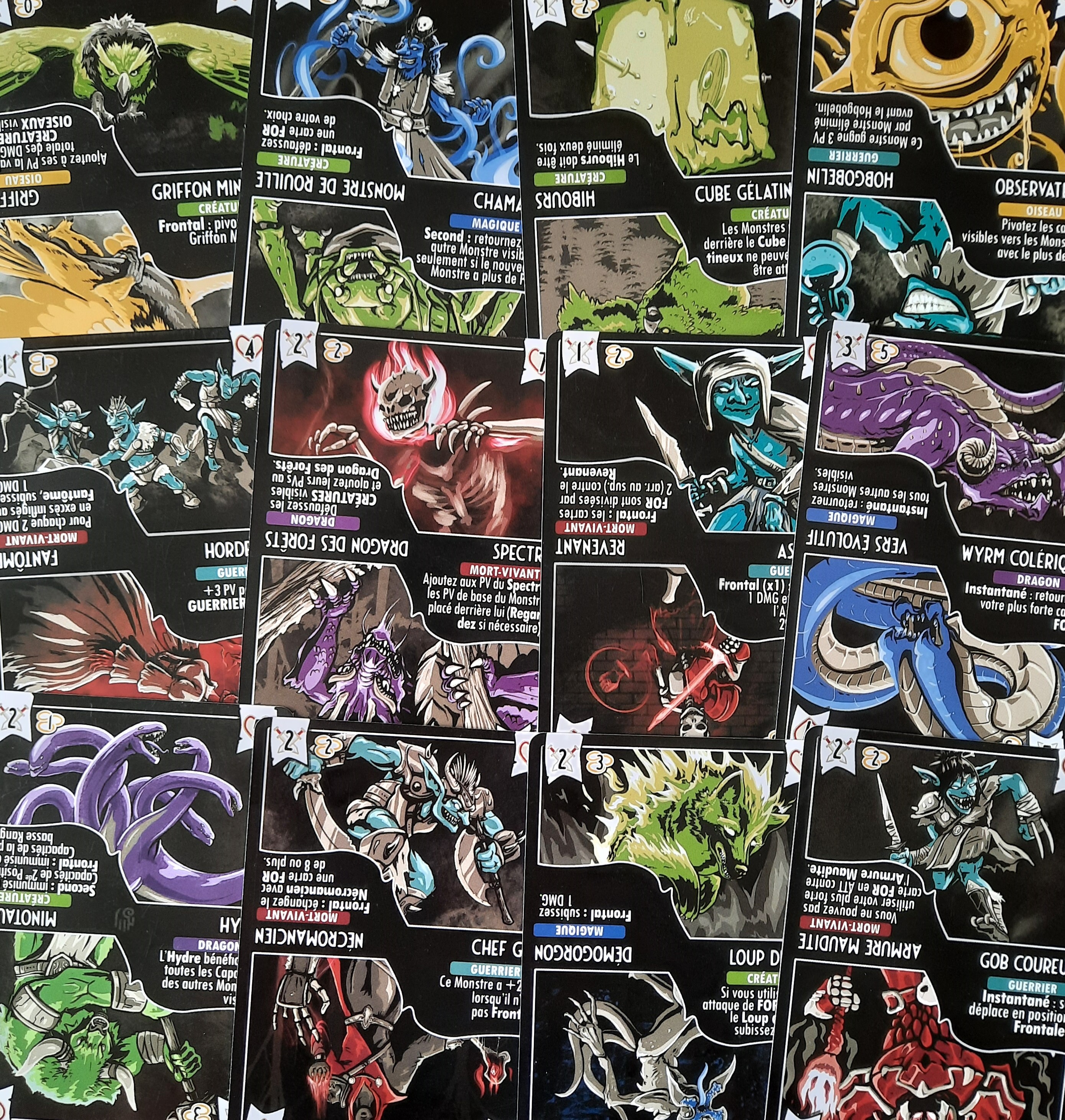 Chaque monstre appartient à un type, possède des points de vie, une valeur de dommage et surtout une capacité qui sapplique dès quil devient visible. Pour zigouiller un monstre, vous devrez jouer une ou plusieurs cartes «Force» dont la valeur totale est égale ou supérieure aux PV dudit monstre. Attention: le cadavre ne rend pas la monnaie! La carte du monstre terrassé vient alors sajouter à vos cartes «Force» restantes.